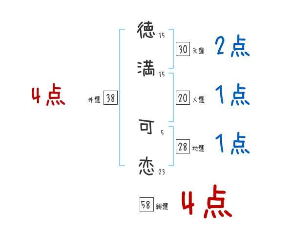 総運![]() | 徳満可恋さんの総運は58画の4つ星!安定した生活。大器晩成タイプ。 あなたの人生を表す1番重要な運勢です。生涯を通じて影響する総合運となり、主に50歳以降の晩年期に影響を及ぼします。 |