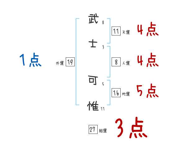 天運![]() | 武士可惟さんの天運は11画の4つ星!着実に富や地位を得る幸運な人生。 家系が持つ宿命的な運勢を表します。祖先から受け継いだ苗字ですので自分の力が及びません。家柄を象徴します。 |