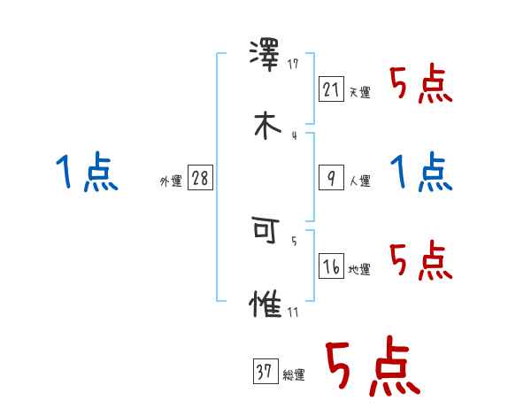 総運![]() | 澤木可惟さんの総運は37画の5つ星!努力家で順応性に優れる。現実的な考え方ができ忠実に物事をこなす。 あなたの人生を表す1番重要な運勢です。生涯を通じて影響する総合運となり、主に50歳以降の晩年期に影響を及ぼします。 |