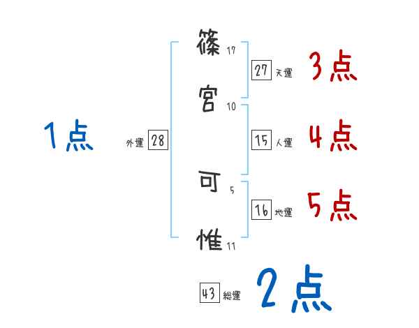 外運![]() | 篠宮可惟さんの外運は28画の1つ星!家庭環境に注意。スポーツで活躍できる能力があるかも。 生活面を象徴する運勢です。外部から受ける影響力を表し、結婚運、家庭運や職場、環境への順応性を表します。 |
