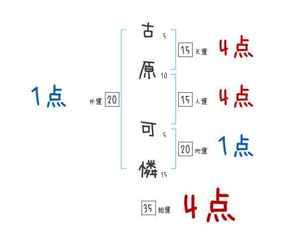 天運![]() | 古原可憐さんの天運は15画の4つ星!人徳があり出世する。順調に物事を進め円満な人生。 家系が持つ宿命的な運勢を表します。祖先から受け継いだ苗字ですので自分の力が及びません。家柄を象徴します。 |