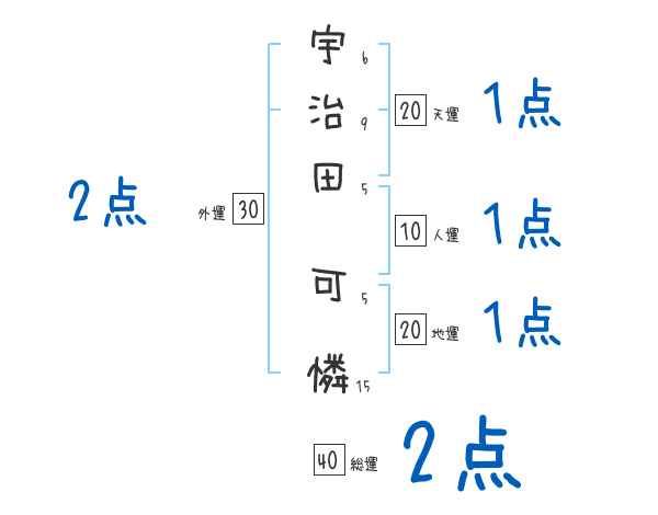 人運![]() | 宇治田可憐さんの人運は10画の1つ星!不安を感じやすい傾向。ストレスを抱えないように注意しましょう。 性格や才能などを表す2番目に重要な運勢です。人間関係や協調性、社会的な成功に影響します。主に20歳から50歳ぐらいまでの中年期の運勢を表します。 |