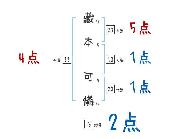 天運![]() | 藏本可憐さんの天運は23画の5つ星!想像力に優れ活力がある。一代で成功し名誉を手に入れる。 家系が持つ宿命的な運勢を表します。祖先から受け継いだ苗字ですので自分の力が及びません。家柄を象徴します。 |
