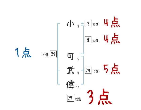 天運![]() | 小可武偉さんの天運は3画の4つ星!活動的で才能に恵まれ、多くの信頼を得る。希望に満ち成長する。 家系が持つ宿命的な運勢を表します。祖先から受け継いだ苗字ですので自分の力が及びません。家柄を象徴します。 |