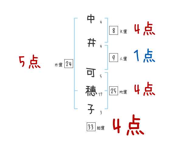 外運![]() | 中井可穂子さんの外運は24画の5つ星!家庭運が良く順調な人生。金運にも恵まれる。 生活面を象徴する運勢です。外部から受ける影響力を表し、結婚運、家庭運や職場、環境への順応性を表します。 |