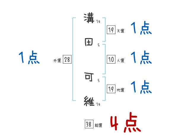 天運![]() | 溝田可維さんの天運は19画の1つ星!優れた才能を持ちますが、協調性が足りないことも。周りの人と協力する事を意識しましょう。 家系が持つ宿命的な運勢を表します。祖先から受け継いだ苗字ですので自分の力が及びません。家柄を象徴します。 |