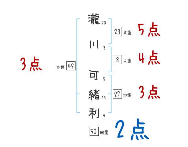 天運![]() | 瀧川可緒利さんの天運は23画の5つ星!想像力に優れ活力がある。一代で成功し名誉を手に入れる。 家系が持つ宿命的な運勢を表します。祖先から受け継いだ苗字ですので自分の力が及びません。家柄を象徴します。 |