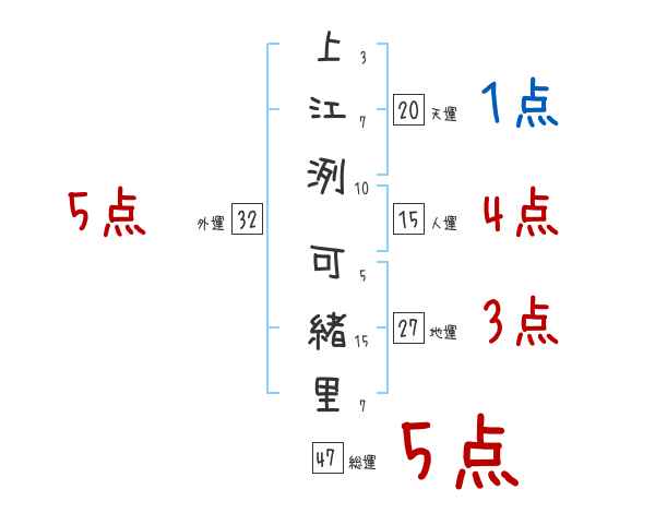 外運![]() | 上江洌可緒里さんの外運は32画の5つ星!柔軟性があり成功する。チャンスが多く金運が良い。 生活面を象徴する運勢です。外部から受ける影響力を表し、結婚運、家庭運や職場、環境への順応性を表します。 |