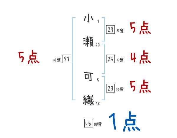 天運![]() | 小瀬可織さんの天運は23画の5つ星!想像力に優れ活力がある。一代で成功し名誉を手に入れる。 家系が持つ宿命的な運勢を表します。祖先から受け継いだ苗字ですので自分の力が及びません。家柄を象徴します。 |