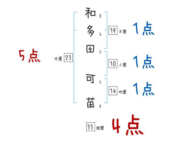 天運![]() | 和多田可苗さんの天運は19画の1つ星!優れた才能を持ちますが、協調性が足りないことも。周りの人と協力する事を意識しましょう。 家系が持つ宿命的な運勢を表します。祖先から受け継いだ苗字ですので自分の力が及びません。家柄を象徴します。 |