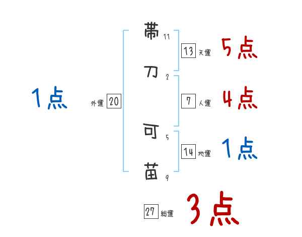 総運![]() | 帯刀可苗さんの総運は27画の3つ星!頭脳明晰だが強情で摩擦が多い傾向。孤立に注意。 あなたの人生を表す1番重要な運勢です。生涯を通じて影響する総合運となり、主に50歳以降の晩年期に影響を及ぼします。 |
