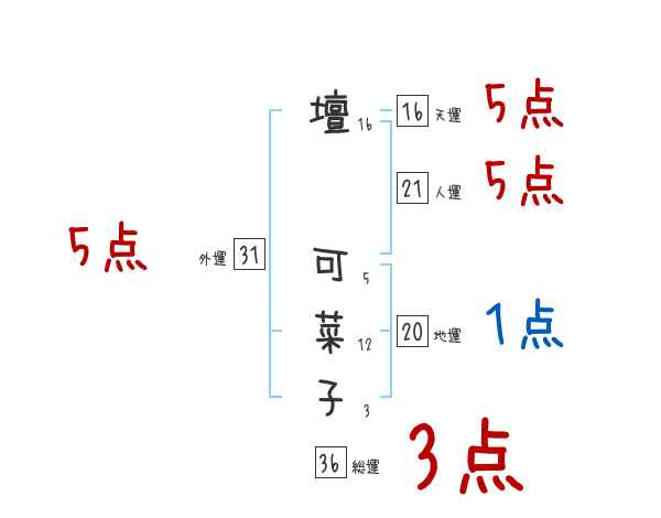 人運![]() | 壇可菜子さんの人運は21画の5つ星!統率力がある。独立し成功する。名誉を手に入れる。 性格や才能などを表す2番目に重要な運勢です。人間関係や協調性、社会的な成功に影響します。主に20歳から50歳ぐらいまでの中年期の運勢を表します。 |