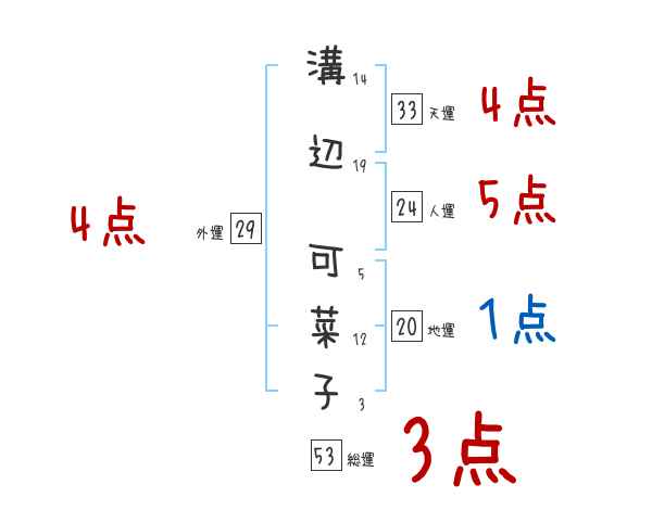 人運![]() | 溝辺可菜子さんの人運は24画の5つ星!家庭運が良く順調な人生。金運にも恵まれる。 性格や才能などを表す2番目に重要な運勢です。人間関係や協調性、社会的な成功に影響します。主に20歳から50歳ぐらいまでの中年期の運勢を表します。 |