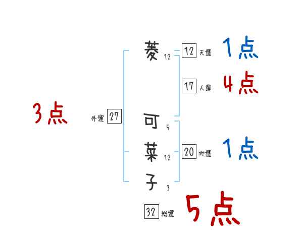 総運![]() | 菱可菜子さんの総運は32画の5つ星!柔軟性があり成功する。チャンスが多く金運が良い。 あなたの人生を表す1番重要な運勢です。生涯を通じて影響する総合運となり、主に50歳以降の晩年期に影響を及ぼします。 |