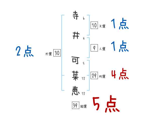 総運![]() | 寺井可菜恵さんの総運は39画の5つ星!社交性に優れ人望が厚い。人の上に立ち成功する。 あなたの人生を表す1番重要な運勢です。生涯を通じて影響する総合運となり、主に50歳以降の晩年期に影響を及ぼします。 |