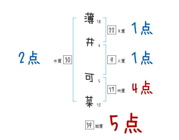総運![]() | 薄井可菜さんの総運は39画の5つ星!社交性に優れ人望が厚い。人の上に立ち成功する。 あなたの人生を表す1番重要な運勢です。生涯を通じて影響する総合運となり、主に50歳以降の晩年期に影響を及ぼします。 |