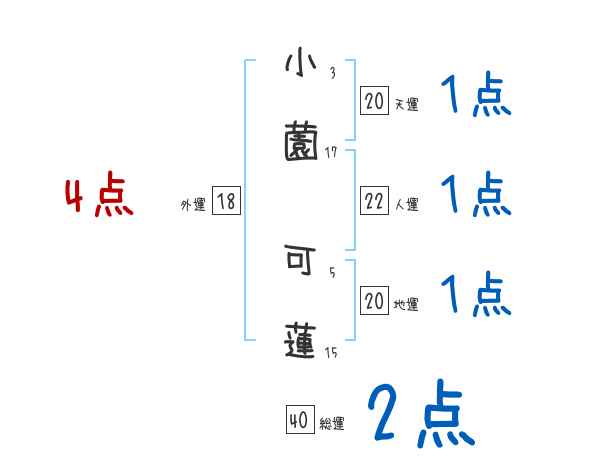 外運![]() | 小薗可蓮さんの外運は18画の4つ星!情熱的で剛気。忍耐力があり信頼される。 生活面を象徴する運勢です。外部から受ける影響力を表し、結婚運、家庭運や職場、環境への順応性を表します。 |