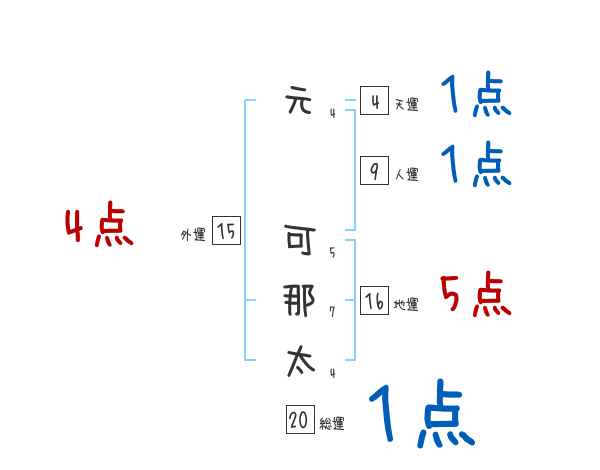 天運![]() | 元可那太さんの天運は4画の1つ星!感情が不安定で苦労するかも。周囲との協調を心掛けましょう。 家系が持つ宿命的な運勢を表します。祖先から受け継いだ苗字ですので自分の力が及びません。家柄を象徴します。 |