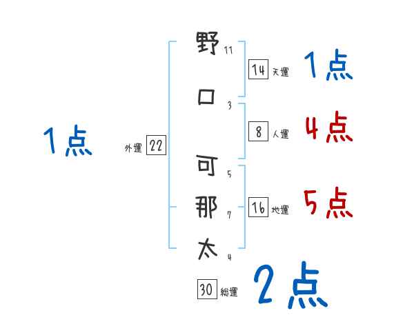 外運![]() | 野口可那太さんの外運は22画の1つ星!努力することが苦手ないっぽう手先が器用。芸術性にも優れる。 生活面を象徴する運勢です。外部から受ける影響力を表し、結婚運、家庭運や職場、環境への順応性を表します。 |