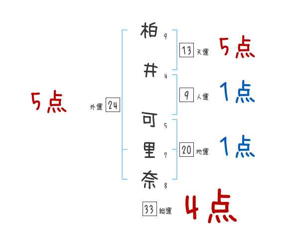 外運![]() | 柏井可里奈さんの外運は24画の5つ星!家庭運が良く順調な人生。金運にも恵まれる。 生活面を象徴する運勢です。外部から受ける影響力を表し、結婚運、家庭運や職場、環境への順応性を表します。 |