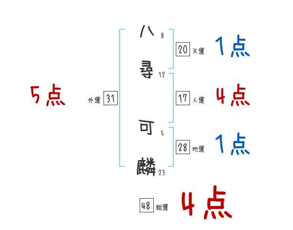 外運![]() | 八尋可麟さんの外運は31画の5つ星!社交性があり判断力に優れる。順風満帆な人生で円満な生活。 生活面を象徴する運勢です。外部から受ける影響力を表し、結婚運、家庭運や職場、環境への順応性を表します。 |