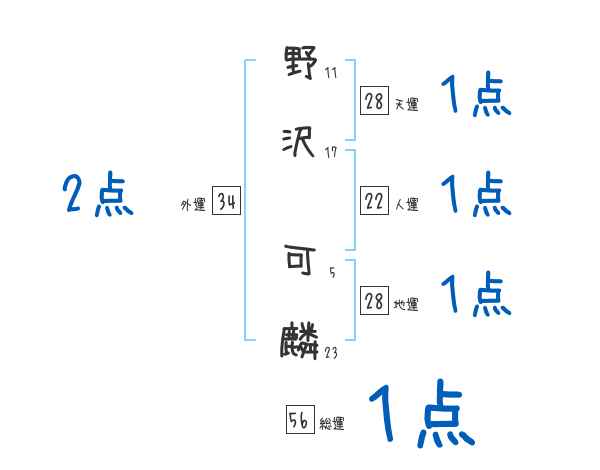 天運![]() | 野沢可麟さんの天運は28画の1つ星!家庭環境に注意。スポーツで活躍できる能力があるかも。 家系が持つ宿命的な運勢を表します。祖先から受け継いだ苗字ですので自分の力が及びません。家柄を象徴します。 |