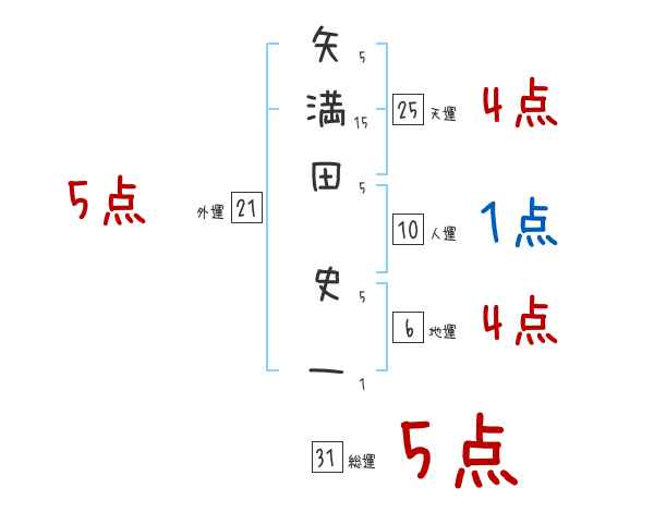 外運![]() | 矢満田史一さんの外運は21画の5つ星!統率力がある。独立し成功する。名誉を手に入れる。 生活面を象徴する運勢です。外部から受ける影響力を表し、結婚運、家庭運や職場、環境への順応性を表します。 |
