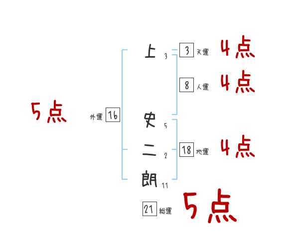 外運![]() | 上史二朗さんの外運は16画の5つ星!人望が厚く大きく発展する。逆転成功が見える。 生活面を象徴する運勢です。外部から受ける影響力を表し、結婚運、家庭運や職場、環境への順応性を表します。 |