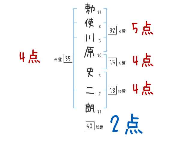 天運![]() | 勅使川原史二朗さんの天運は32画の5つ星!柔軟性があり成功する。チャンスが多く金運が良い。 家系が持つ宿命的な運勢を表します。祖先から受け継いだ苗字ですので自分の力が及びません。家柄を象徴します。 |