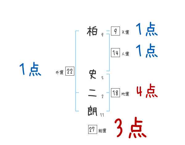 外運![]() | 柏史二朗さんの外運は22画の1つ星!努力することが苦手ないっぽう手先が器用。芸術性にも優れる。 生活面を象徴する運勢です。外部から受ける影響力を表し、結婚運、家庭運や職場、環境への順応性を表します。 |