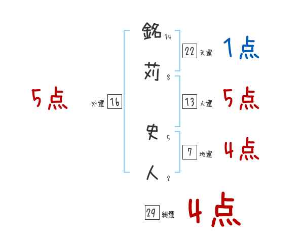 人運![]() | 銘苅史人さんの人運は13画の5つ星!才能に恵まれ人気がある。名声を手に入れる。円満な人生。 性格や才能などを表す2番目に重要な運勢です。人間関係や協調性、社会的な成功に影響します。主に20歳から50歳ぐらいまでの中年期の運勢を表します。 |