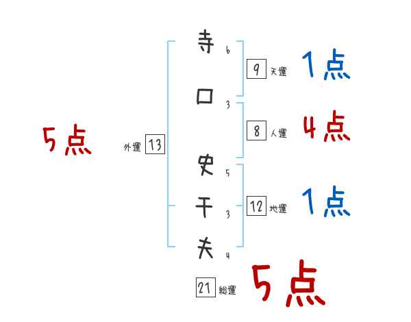 天運![]() | 寺口史千夫さんの天運は9画の1つ星!消極的で才能を発揮することが苦手なことも。周りの意見に耳を傾けましょう。 家系が持つ宿命的な運勢を表します。祖先から受け継いだ苗字ですので自分の力が及びません。家柄を象徴します。 |