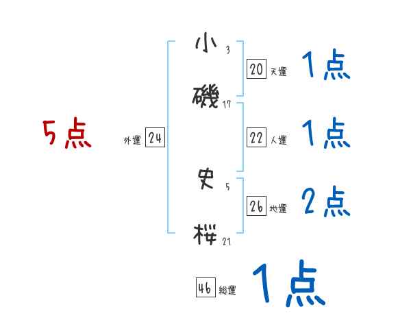 外運![]() | 小磯史桜さんの外運は24画の5つ星!家庭運が良く順調な人生。金運にも恵まれる。 生活面を象徴する運勢です。外部から受ける影響力を表し、結婚運、家庭運や職場、環境への順応性を表します。 |