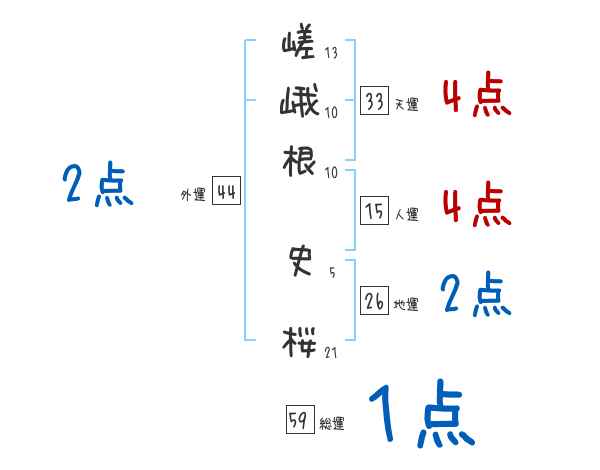 天運![]() | 嵯峨根史桜さんの天運は33画の4つ星!権力志向でプライドが高い。勇気があり運を切り開き成功する。 家系が持つ宿命的な運勢を表します。祖先から受け継いだ苗字ですので自分の力が及びません。家柄を象徴します。 |