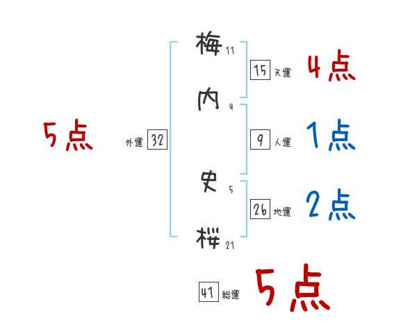 外運![]() | 梅内史桜さんの外運は32画の5つ星!柔軟性があり成功する。チャンスが多く金運が良い。 生活面を象徴する運勢です。外部から受ける影響力を表し、結婚運、家庭運や職場、環境への順応性を表します。 |