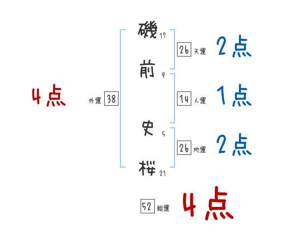 天運![]() | 磯前史桜さんの天運は26画の2つ星!波瀾万丈かも。信頼できる人を大事にしましょう。 家系が持つ宿命的な運勢を表します。祖先から受け継いだ苗字ですので自分の力が及びません。家柄を象徴します。 |