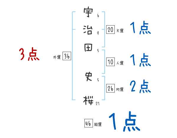 外運![]() | 宇治田史桜さんの外運は36画の3つ星!先見性が豊かです。多少神経質で苦労することも。 生活面を象徴する運勢です。外部から受ける影響力を表し、結婚運、家庭運や職場、環境への順応性を表します。 |