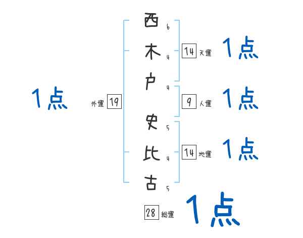 天運![]() | 西木戸史比古さんの天運は14画の1つ星!人に対して優しいがストレスを溜め込みがち。人間関係のトラブルを避けるよう気をつけましょう。 家系が持つ宿命的な運勢を表します。祖先から受け継いだ苗字ですので自分の力が及びません。家柄を象徴します。 |