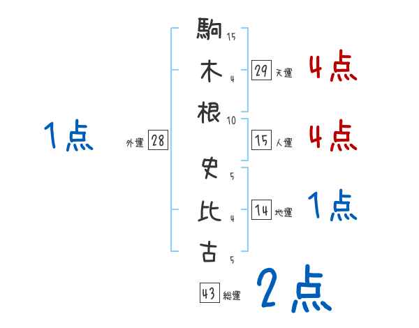 外運![]() | 駒木根史比古さんの外運は28画の1つ星!家庭環境に注意。スポーツで活躍できる能力があるかも。 生活面を象徴する運勢です。外部から受ける影響力を表し、結婚運、家庭運や職場、環境への順応性を表します。 |
