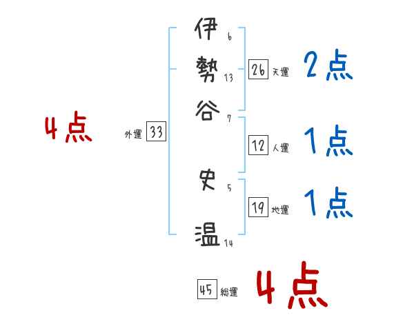 外運![]() | 伊勢谷史温さんの外運は33画の4つ星!権力志向でプライドが高い。勇気があり運を切り開き成功する。 生活面を象徴する運勢です。外部から受ける影響力を表し、結婚運、家庭運や職場、環境への順応性を表します。 |