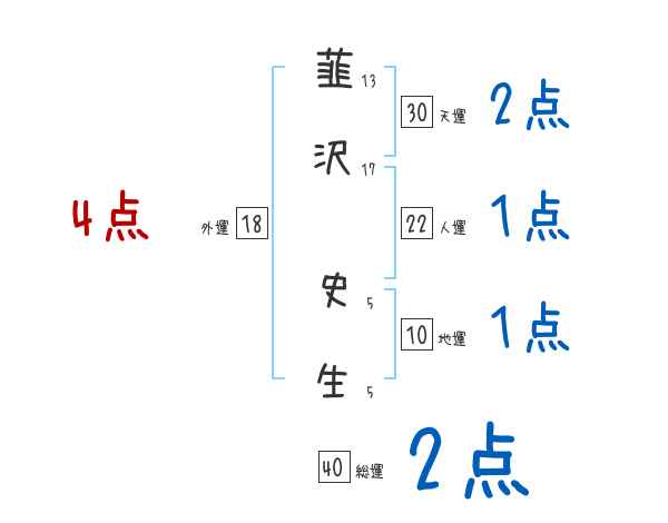 天運![]() | 韮沢史生さんの天運は30画の2つ星!浮き沈みの激しさに注意しましょう。 家系が持つ宿命的な運勢を表します。祖先から受け継いだ苗字ですので自分の力が及びません。家柄を象徴します。 |