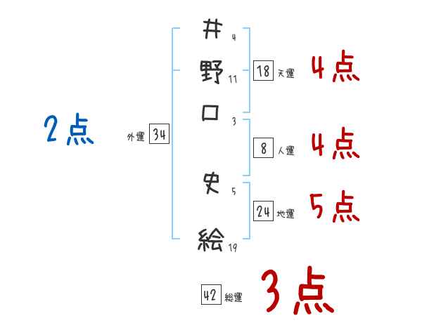 天運![]() | 井野口史絵さんの天運は18画の4つ星!情熱的で剛気。忍耐力があり信頼される。 家系が持つ宿命的な運勢を表します。祖先から受け継いだ苗字ですので自分の力が及びません。家柄を象徴します。 |