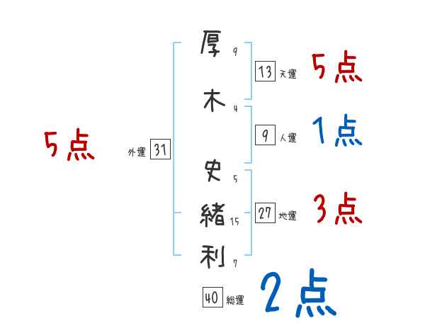 天運![]() | 厚木史緒利さんの天運は13画の5つ星!才能に恵まれ人気がある。名声を手に入れる。円満な人生。 家系が持つ宿命的な運勢を表します。祖先から受け継いだ苗字ですので自分の力が及びません。家柄を象徴します。 |