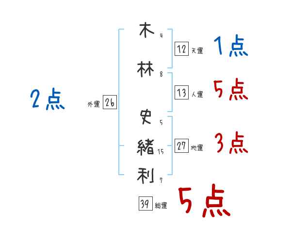 天運![]() | 木林史緒利さんの天運は12画の1つ星!簡単な失敗で諦めてしまいやすいかも。着実に行動すると良いでしょう。 家系が持つ宿命的な運勢を表します。祖先から受け継いだ苗字ですので自分の力が及びません。家柄を象徴します。 |
