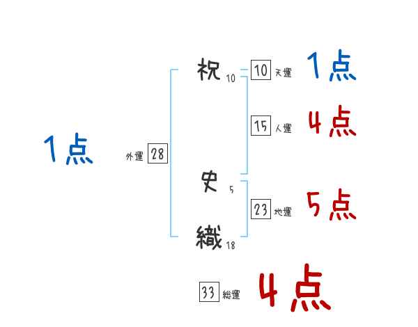 天運![]() | 祝史織さんの天運は10画の1つ星!不安を感じやすい傾向。ストレスを抱えないように注意しましょう。 家系が持つ宿命的な運勢を表します。祖先から受け継いだ苗字ですので自分の力が及びません。家柄を象徴します。 |