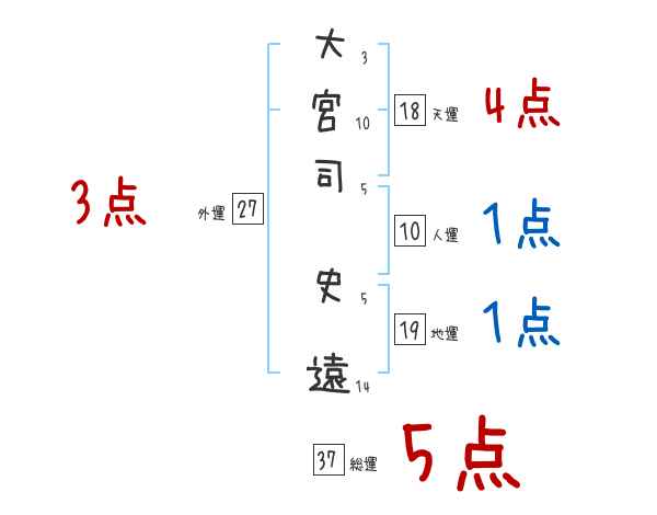 天運![]() | 大宮司史遠さんの天運は18画の4つ星!情熱的で剛気。忍耐力があり信頼される。 家系が持つ宿命的な運勢を表します。祖先から受け継いだ苗字ですので自分の力が及びません。家柄を象徴します。 |