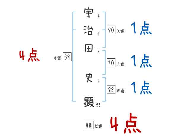 総運![]() | 宇治田史顕さんの総運は48画の4つ星!賢明な性格で人望が厚い。指導力があり多くの人に尊敬される。 あなたの人生を表す1番重要な運勢です。生涯を通じて影響する総合運となり、主に50歳以降の晩年期に影響を及ぼします。 |