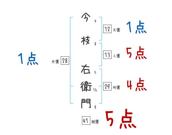 天運![]() | 今枝右衛門さんの天運は12画の1つ星!簡単な失敗で諦めてしまいやすいかも。着実に行動すると良いでしょう。 家系が持つ宿命的な運勢を表します。祖先から受け継いだ苗字ですので自分の力が及びません。家柄を象徴します。 |