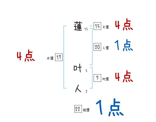 総運![]() | 蓮叶人さんの総運は22画の1つ星!努力することが苦手ないっぽう手先が器用。芸術性にも優れる。 あなたの人生を表す1番重要な運勢です。生涯を通じて影響する総合運となり、主に50歳以降の晩年期に影響を及ぼします。 |