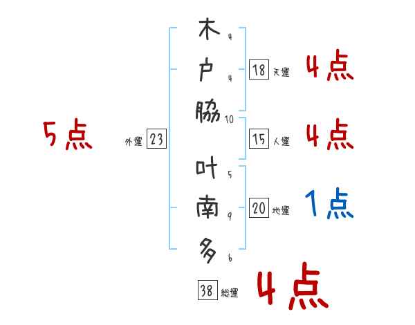 外運![]() | 木戸脇叶南多さんの外運は23画の5つ星!想像力に優れ活力がある。一代で成功し名誉を手に入れる。 生活面を象徴する運勢です。外部から受ける影響力を表し、結婚運、家庭運や職場、環境への順応性を表します。 |